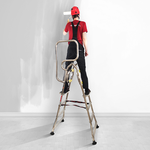 Składana platforma robocza PPP przeznaczona do prac tynkarskich i malarskich. Wyposażona w antypoślizgową kratę GRP, poręcz ochronną oraz funkcjonalne haki na akcesoria. Lekka, stabilna i odporna na korozję, umożliwia przemieszczanie się bez konieczności schodzenia. Idealna do zastosowań profesjonalnych i przydomowych.
